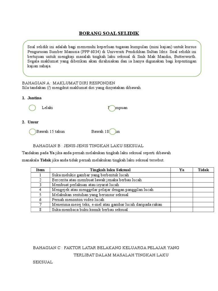 Download Full PDF Package. Save Save BORANG SOAL SELIDIK For Later. Kemungkinan responden menjawab soalan dengan sambil lewa memberi jawapan yang.