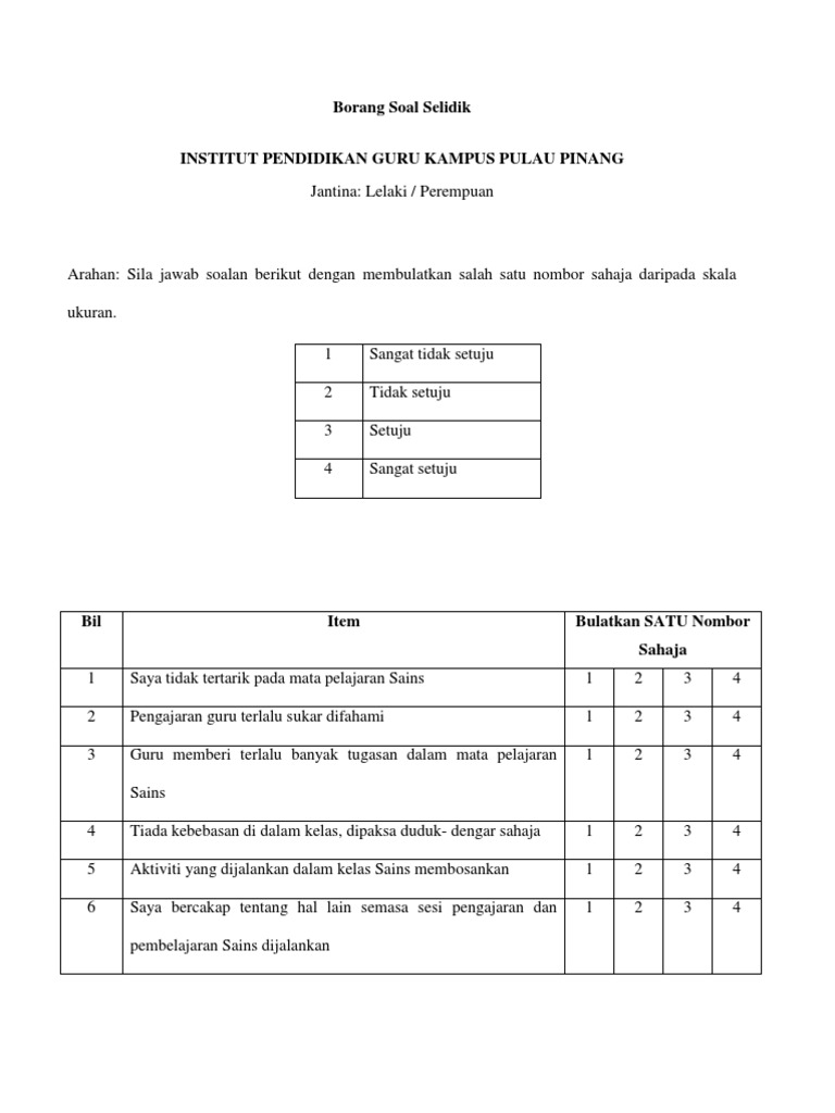 Gillham 2000 menyarankan supaya borang soal selidik dibina antara 4 hingga 6 muka surat sahaja. Simpan Simpan BORANG SOAL SELIDIK Untuk Nanti. Tandai sebagai konten tidak pantas.